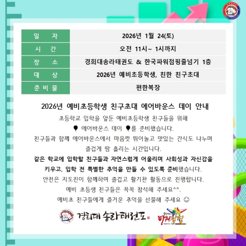 ÃʵîÇб³ ÀÔÇÐÀ» ¾ÕµÐ ¿¹ºñÃʵîÇлý Ä£±¸µéÀ» À§ÇØ 🎈 ¿¡¾î¹Ù¿î½º µ¥ÀÌ 🎈¸¦ ÁغñÇß½À´Ï´Ù. Ä£±¸µé°ú ÇÔ²² ¿¡¾î¹Ù¿î½º¿¡¼ ¸¶À½²¯ ¶Ù¾î³î°í ¸ÀÀÖ´Â °£½Äµµ ³ª´©¸ç Áñ°Ì°Ô ¶¡ È긮´Â ½Ã°£ÀÔ´Ï´Ù. °°Àº Çб³¿¡ ÀÔÇÐÇÒ Ä£±¸µé°ú ÀÚ¿¬½º·´°Ô ¾î¿ï¸®¸ç »çȸ¼º°ú ÀڽۨÀ» Ű¿ì°í, ÀÔÇÐ Àü Ưº°ÇÑ Ãß¾ïÀ» ¸¸µé ¼ö ÀÖµµ·Ï ÁغñÇß½À´Ï´Ù. ¾ÈÀüÀº ÁöµµÁøÀÌ ÇÔ²²Çϸç Áñ°Ì°í Ȱ±âÂù Ȱµ¿À¸·Î ÁøÇàÇÕ´Ï´Ù. ¿¹ºñ Ãʵî»ý Ä£±¸µéÀº ²À²À Âü¼®ÇØ ÁÖ¼¼¿ä^^.