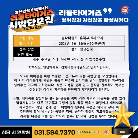 űǵµ¸¦ ½ÃÀÛÇÑ ¿ì¸® À¯¾Æ Ä£±¸µéÀÌ ¹«´ë °æÇè°ú Àڽۨ, Çùµ¿½ÉÀ» Ű¿ï ¼ö ÀÖ´Â ¼Û¶ó À¯¾Æ ¸®Æ²½Ã¹ü´ÜÀ» ¸ðÁýÇÕ´Ï´Ù. 😊 ¸¹Àº °æÇèÀ» ÅëÇØ ¾ÆÀ̵éÀÌ ÇÑÃþ ´õ ¼ºÀåÇÒ ¼ö ÀÖµµ·Ï ÁöµµÇϰڽÀ´Ï´Ù. 📌 ¸ðÁý ´ë»ó °æÈñ´ë ¼Û¶óűǵµ ¼ö·Ã»ý ³ë¶û¶ì ÀÌ»ó / Çö 5¼¼ ~ 7¼¼ (¡Ø 5¼¼´Â Å×½ºÆ® ÈÄ ¼±¹ß) 📌 ¸ðÁý ±â°£ 2026³â 3¿ù 16ÀÏ(¿ù) ~ 3¿ù 20ÀÏ(±Ý) |